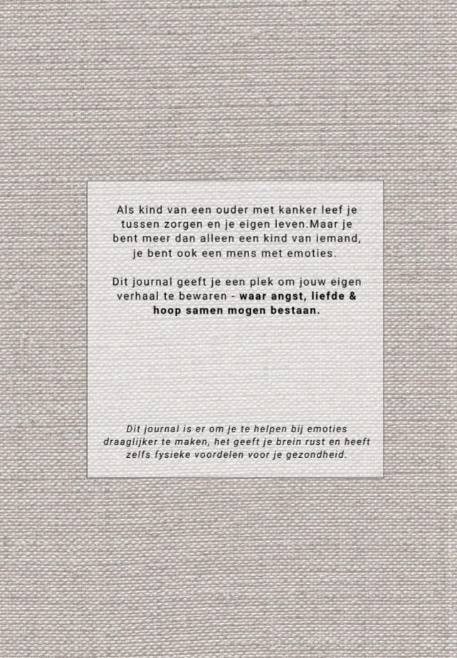 Hier kun je kwijt wat te zwaar voelt om te dragen, of juist wat mooi is om te onthouden. De vragen en opdrachten helpen je woorden te geven aan alles wat er in je leeft — van hoop en liefde tot angst en verdriet.